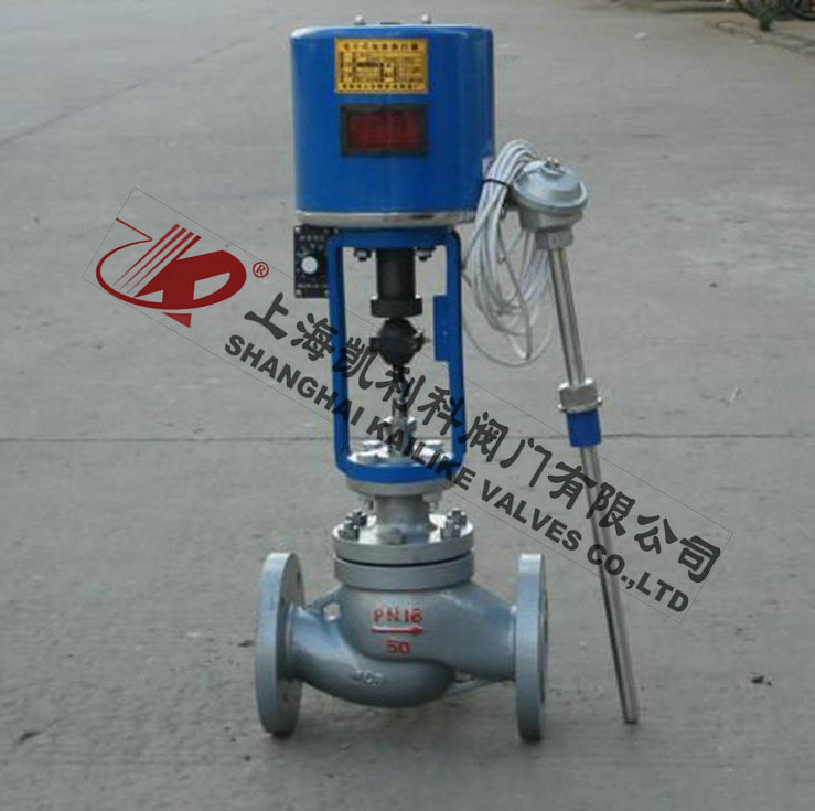 由單座調(diào)節(jié)閥、電動執(zhí)行機(jī)構(gòu)、溫度傳感器和溫度調(diào)節(jié)器等部件組成,根據(jù)用戶需要,分別有加熱型與冷卻型兩種結(jié)構(gòu)。加熱型調(diào)節(jié)閥的結(jié)構(gòu)與原理,工作前主閥芯處于半開位置,傳感器處于自然狀態(tài)。接上電源,主閥芯全開。介質(zhì)由箭頭方向流入主閥體、經(jīng)閥芯對儲熱箱進(jìn)行加熱。當(dāng)溫度升到相應(yīng)設(shè)定值時(shí),傳感器即產(chǎn)生相應(yīng)線性信號輸入一體化執(zhí)行機(jī)構(gòu),隨即驅(qū)動閥桿、閥芯產(chǎn)生位移,關(guān)閉主閥芯停止加熱。當(dāng)溫度低于設(shè)定值時(shí),傳感器即產(chǎn)生線性信號輸入一體化執(zhí)行機(jī)構(gòu),驅(qū)使閥芯漸開,使介質(zhì)按拋物線特性流入儲熱箱,進(jìn)行加熱直至設(shè)定值。這樣被控介質(zhì)始終在設(shè)定溫度范圍內(nèi)被控制,從而達(dá)到控溫目的。