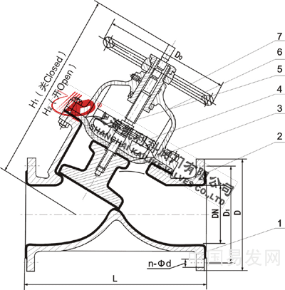 4、閥體與蓋被中間隔膜隔開,使得隔膜上方的閥蓋,閥桿零件不受介質侵蝕;