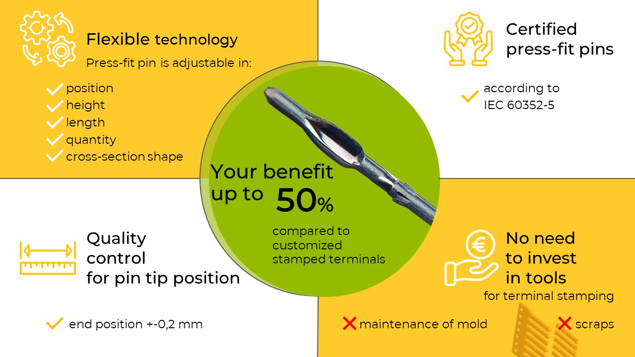 can be adjusted (only select the wire material). Press-fit pins are certified according to IEC 60352-5 and meet high automotive standards.